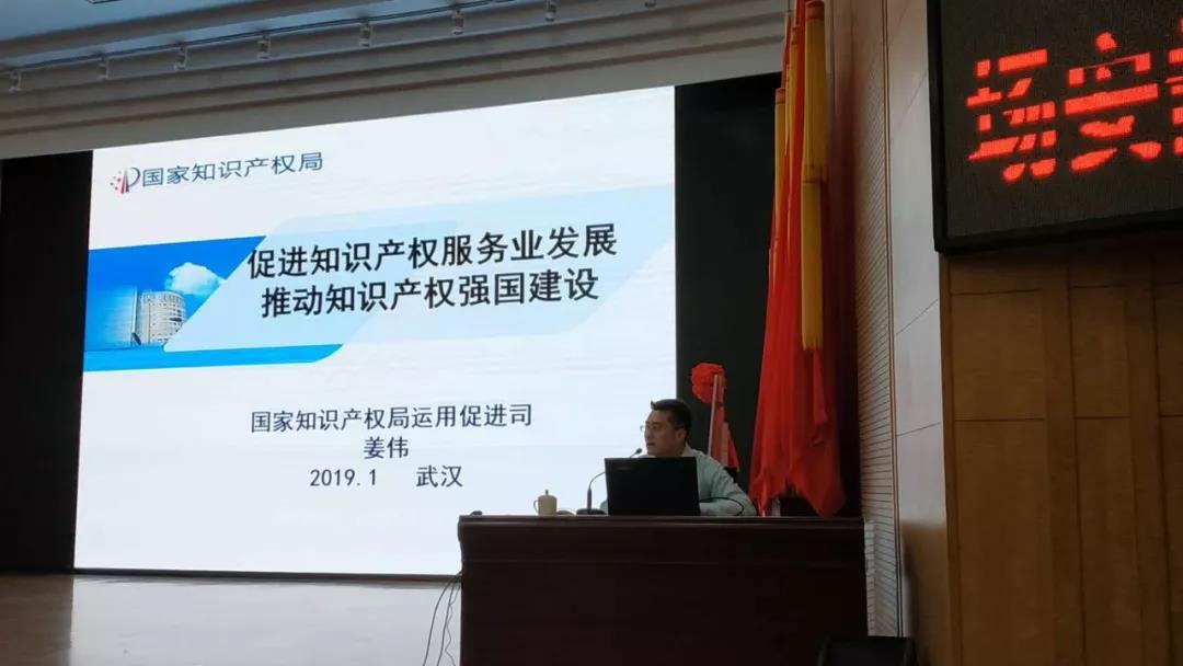 在成立大會結(jié)束之后,舉行專題培訓(xùn)會議。姜偉處長受邀做題為《促進(jìn)知識產(chǎn)權(quán)服務(wù)業(yè)發(fā)展,推動知識產(chǎn)權(quán)強國建設(shè)》的培訓(xùn)講座。培訓(xùn)會由協(xié)會秘書長、武漢科技大學(xué)知識產(chǎn)權(quán)研究所副所長蔡祖國教授主持。